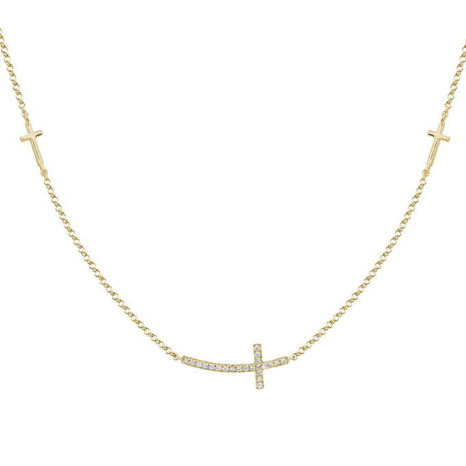 14K YG 16-17-18 inch Necklace. 3 sideways crosses station necklace on 1.2mm adjustable cable chain with lobster clasp. Diamond center cross i. . . Show More