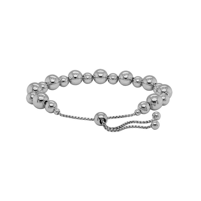 Sterling Silver Rhodium Plated Bracelet. 8mm and 6mm alternating beads bracelet for 5 - 9 inch wrist with sliding bead closure and tassels. Finish: Rhodium Plated