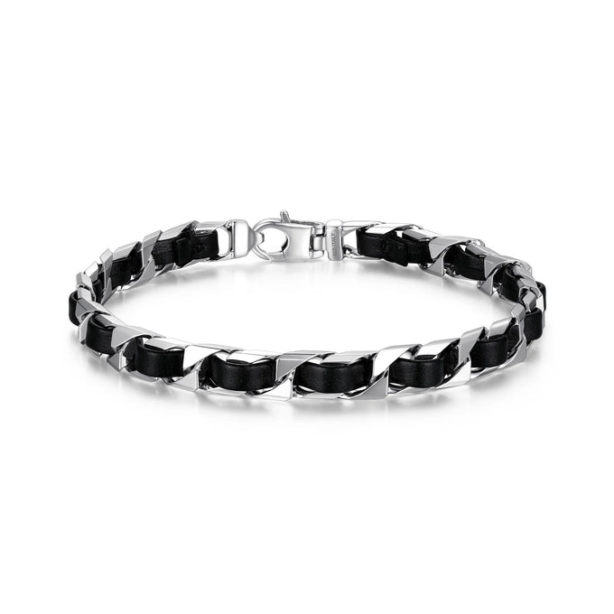 Sterling Silver Curb Chain with Black Leather Bracelet