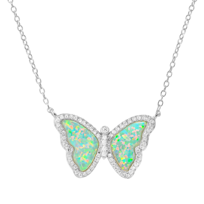 White Sterling Silver Rhodium Plated Stationary Lab Created Opal/Crystal Butterfly Necklace