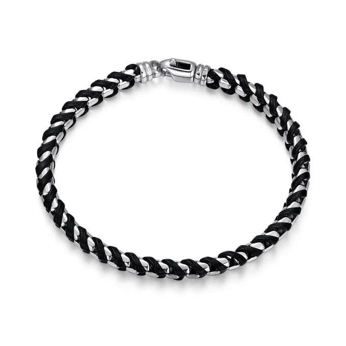 Sterling Silver Round Box Link with Black Leather Bracelet